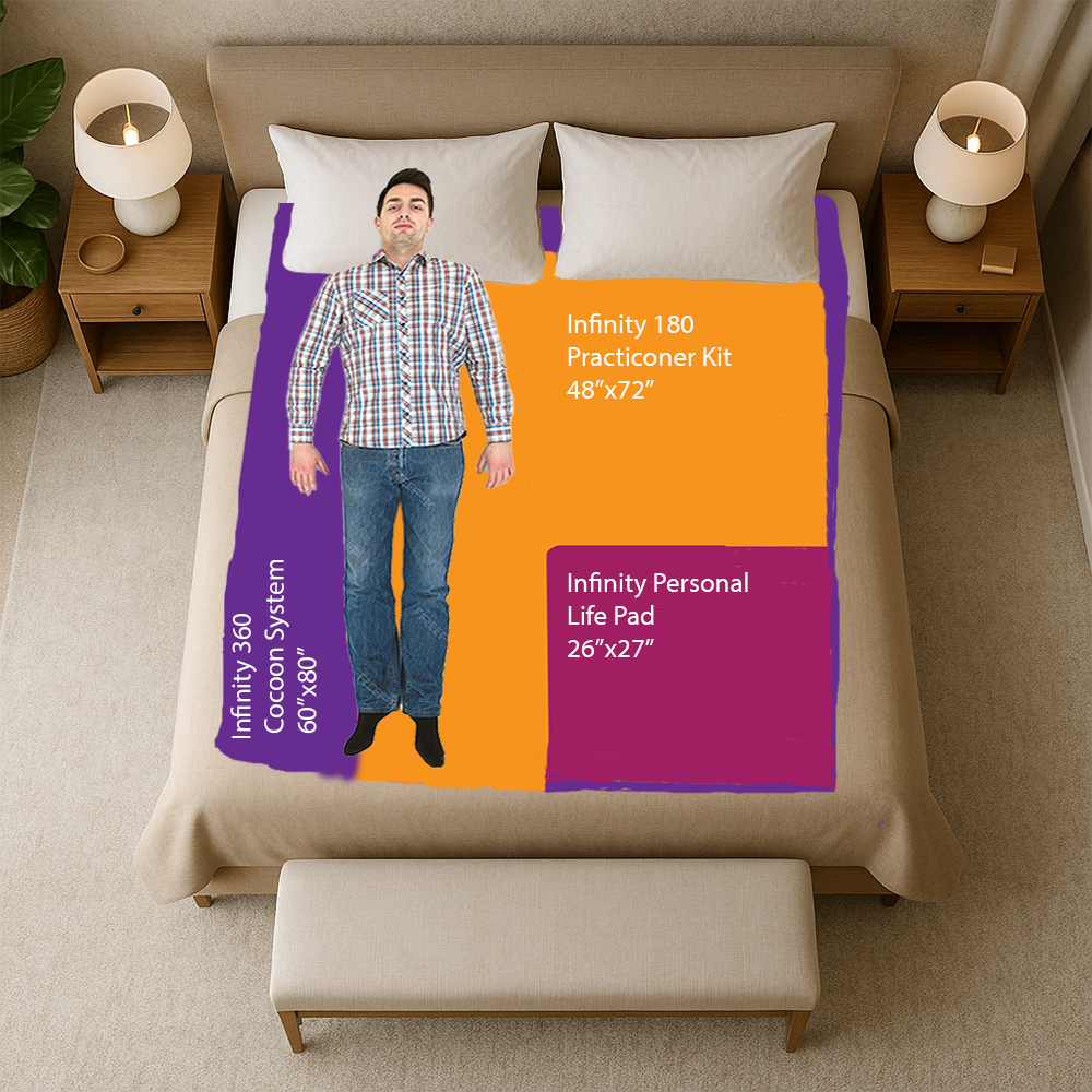 At the core of the 360 Infinity Cocoon is the field created by Tachyonized™ microbeads, woven with precision into an expansive, 60 × 80 inch (150 x 200 cm) blanket, akin to a weighted blanket.